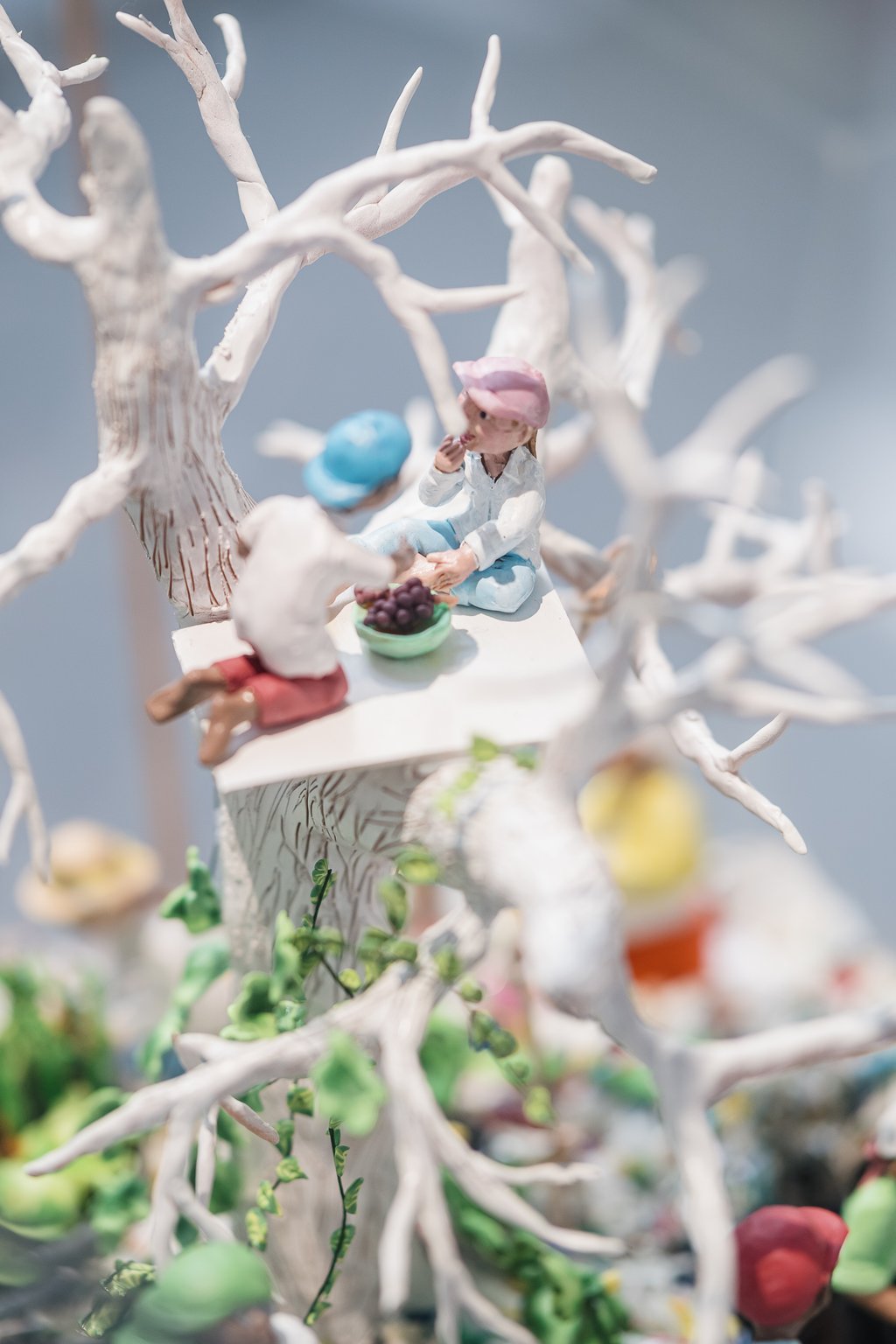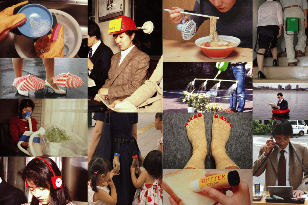 Entrez maintenant dans la deuxième partie, La complainte du progrès, en hommage à la chanson de Boris Vian. Les trois artistes présentés ici dénoncent avec un humour corrosif l’accélération sociétaledans laquelle nous sommes toutes et tous emprisonnés. Dans sa Bulle de vie, l’artiste Karine Gibouloimagine un monde où chacun continuera de mener sa vie malgré tout, perdu au sein d’un environnement où le sol ne sera plus qu’une vaste poubelle. Dans sa boutique fictive, l’artiste Kenji Kawakami vous propose une trentaine de « Chindogus » : ces objets aussi fonctionnels qu’inutiles se raillent de notre culte de l’efficacité… Tout près, les deux personnages sculptés de l’artiste français Daniel Firman ont les bras jonchés d’objets : qui portera la responsabilité de nos surproductions et de leurs conséquences ingérables ? Et que se passera-t-il si nous continuons à vivre ainsi ?