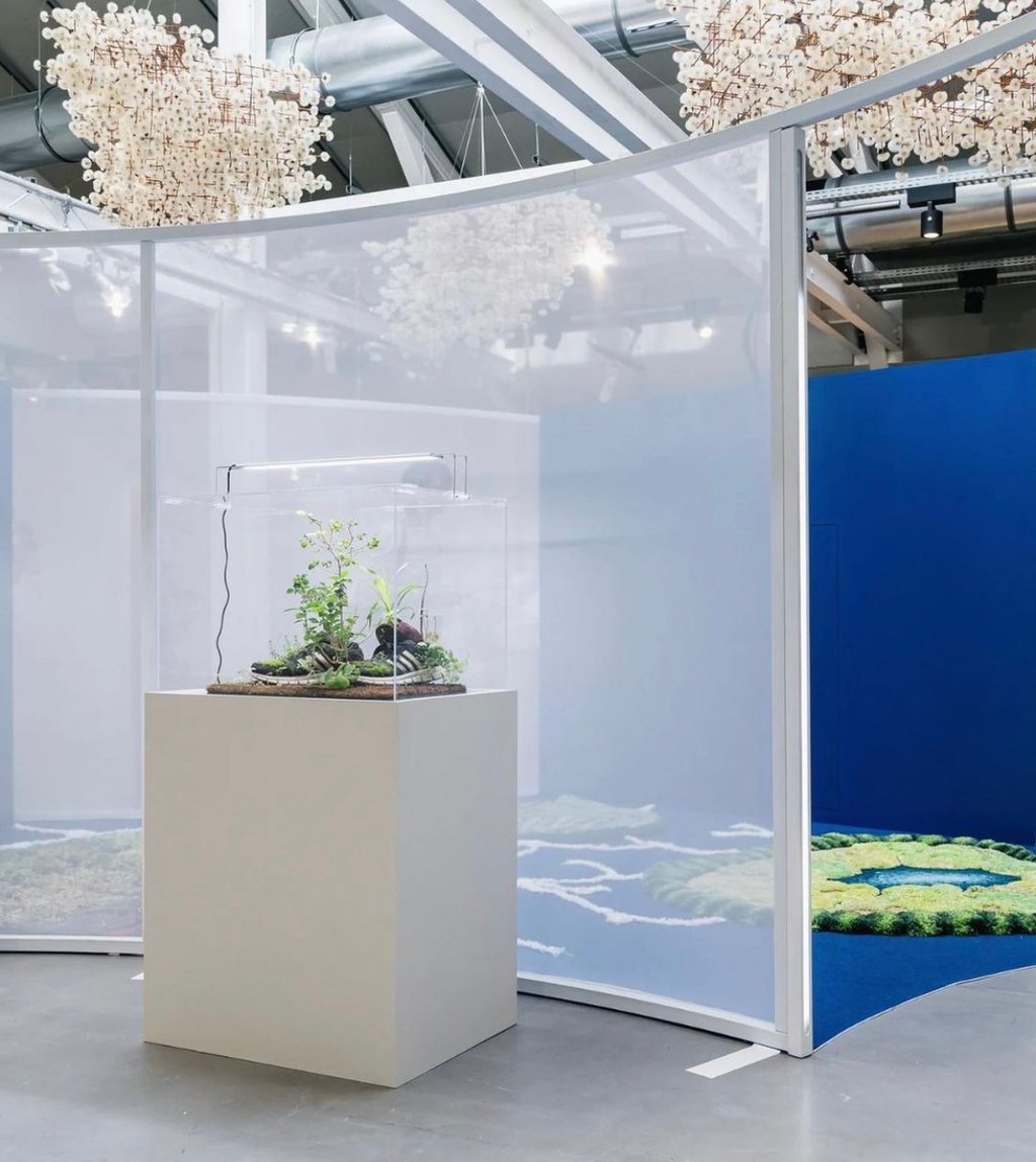 Mais alors, C’est comment qu’on freine ? demandait Alain Bashung. Cette question essentielle est explorée par les quatre artistes de la dernière section. A travers deux œuvres interactives, l’artiste Lyes Hammadouche vous propose de considérer l’instant présent et de laisser l’empreinte de votre passage. Promenez-vous ensuite dans la salle qui explore la relation entre le temps et le vivant. L’artiste Michel Blazy y présente des micro-mondes où la lenteur rappelle qu’elle détient le secret de la vie. Puis, évadez-vous grâce au labyrinthe d’aigrettes de pissenlit de l’artiste Duy Anh Nhan Duc. Contemplez… prenez le temps. Une deuxième œuvre du même artiste vous attend juste à côté : sorte de nuage composé de bois et de fleurs, cette suspension guide votre regard vers le ciel. C’est le moment parfait pour s’allonger sur les îles imaginaires de l’artiste Julie C. Fortier : ses créations en textile olfactif abordent la façon dont nous pouvons habiter ensemble le monde à venir.