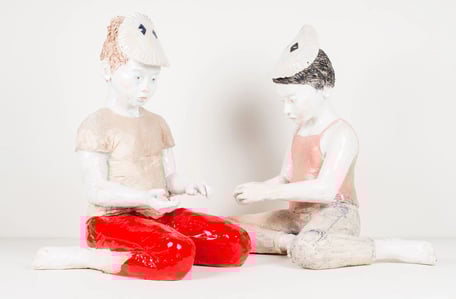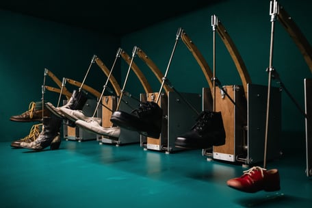 Dans la première partie de l’exposition, Alors on danse, en référence au tube de Stromae, vous allez explorer le Temps à vivre. Dans la salle circulaire, les sculptures et les créations textiles de l’artiste Julia Haumont parlent du temps improductif dont savent si bien s’emparer les enfants et qui fait tant envie. Arpentez ensuite la fresque murale de l’artiste Lingzi Ji : une représentation d’un moment suspendu ordinaire, où l’on est à la fois seul et parmi les autres. Ne soyez pas étonnés par le retentissement soudain ! Il s’agit de l’ouverture du ballet pour chaussures imaginé par l’artiste Arno Fabre : un hymne aux pas que nous déployons pour prendre part à la marche du monde.